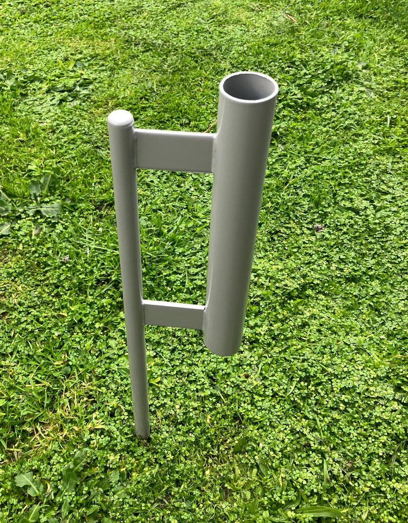 Made from steel, this spike can be driven into the ground with a hammer and will withstand high winds .